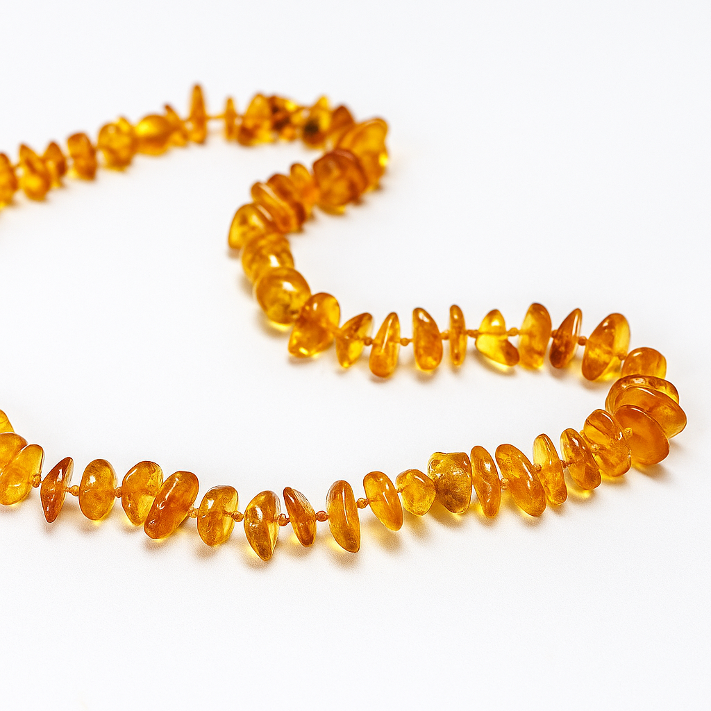 Reconhecido pelo seu poder analgésico e calmante, o Âmbar é amplamente utilizado em bebés e crianças — especialmente em colares e pulseiras — para aliviar as dores da dentição, reduzir inflamações, acalmar a irritabilidade e melhorar o sono.