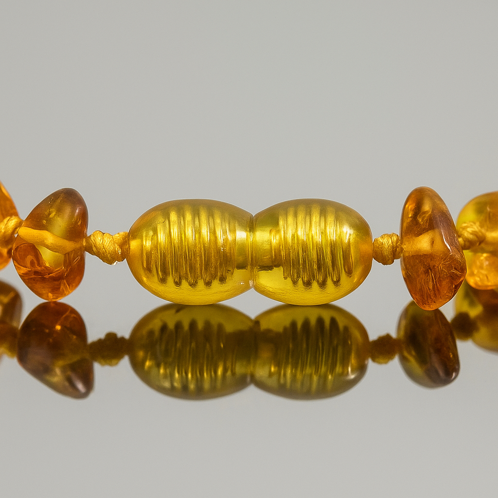 O âmbar é uma resina natural que contém ácido succínico, conhecido pelas suas propriedades calmantes e anti-inflamatórias. Acredita-se que, em contacto com a pele, esse ácido é libertado em pequenas quantidades, ajudando a aliviar o desconforto das gengivas, reduzir a irritabilidade e trazer mais tranquilidade ao bebé.